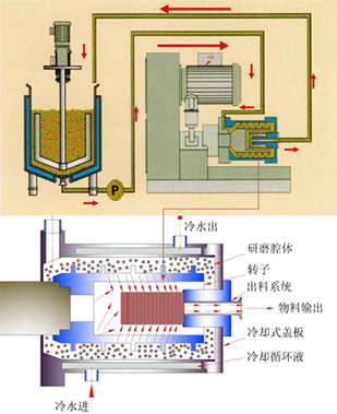 可實現低溫砂磨 縮短漿料在磨腔內的滯留時間,有效抑制溫度上升。通過循環冷卻水的冷卻,可實現低溫砂磨。 |
